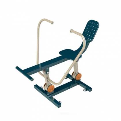 在座板上坐定,手握手扶,脚踩踏板,作双臂伸缩运动。